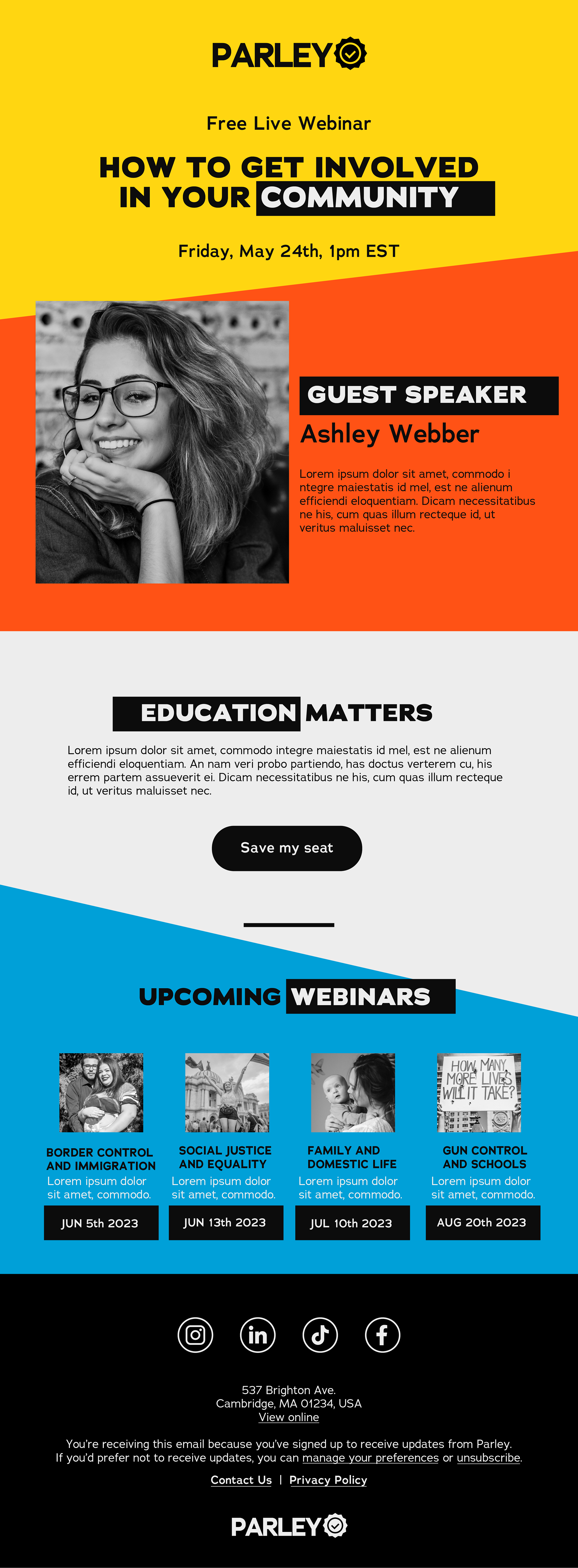 Branding, email and social media layouts for Parley, a digital initiative that seeks to bridge the gap between young people and politics The client wanted a bright, colorful and engaging design that could capture the attention of their young demographic without appearing too childish and immature.